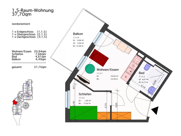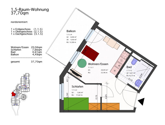 1,5 -Raum-Wohnung 37,70 qm mit Balkon: