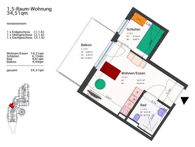 1,5-Raum-Wohnung 34,51 qm mit Balkon: