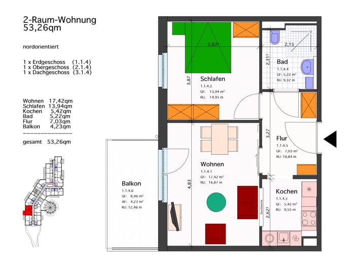 2-Raum-Wohnung 53,26 qm mit Balkon: